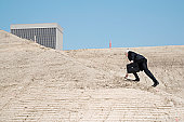 Businessman holding briefcase climbing up graded slope of construction site, side view