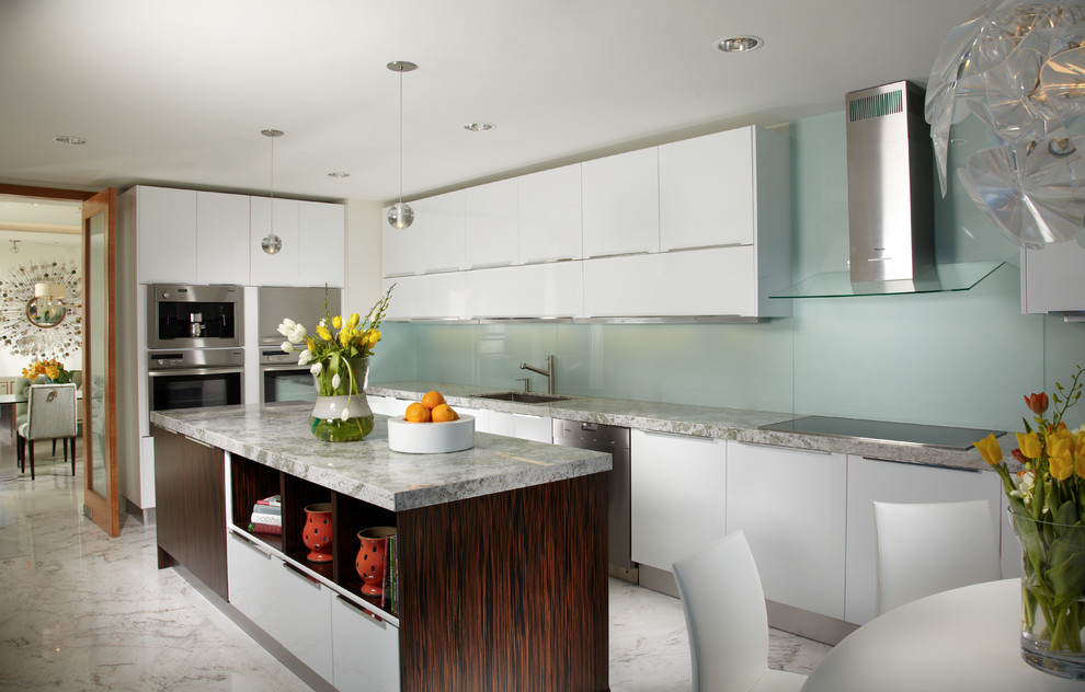 Marble is luxurious, yet soft and porous, requiring regular waxing and sealing. While not ideal as countertop material, it is fine for backsplashes if not located near a heat source, since it is available in a wide range of lighter shades which make the kitchen look brighter.