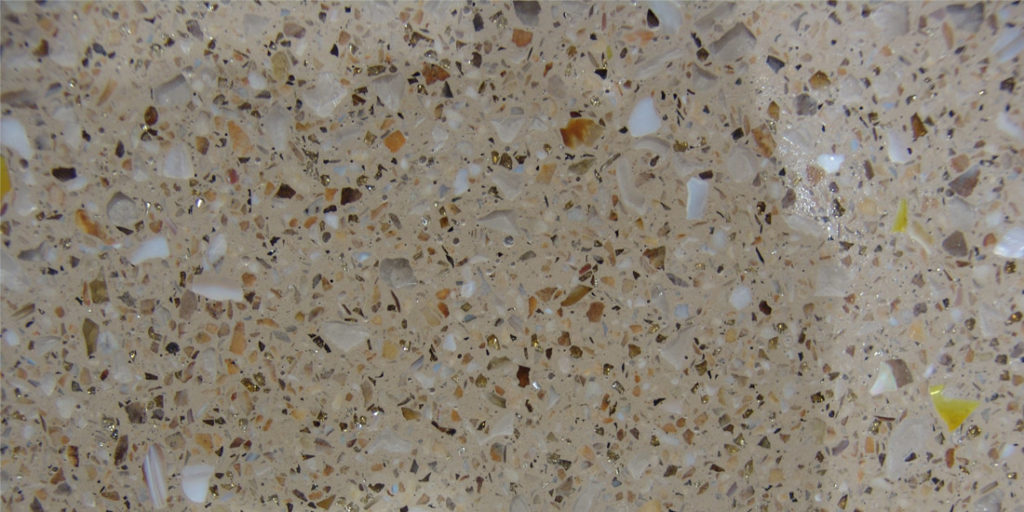 - Composition: Marble, granite, quartz and/or glass chips mixed with a binder like portland cement, polyacrylic-modified portland cement or epoxy resin.