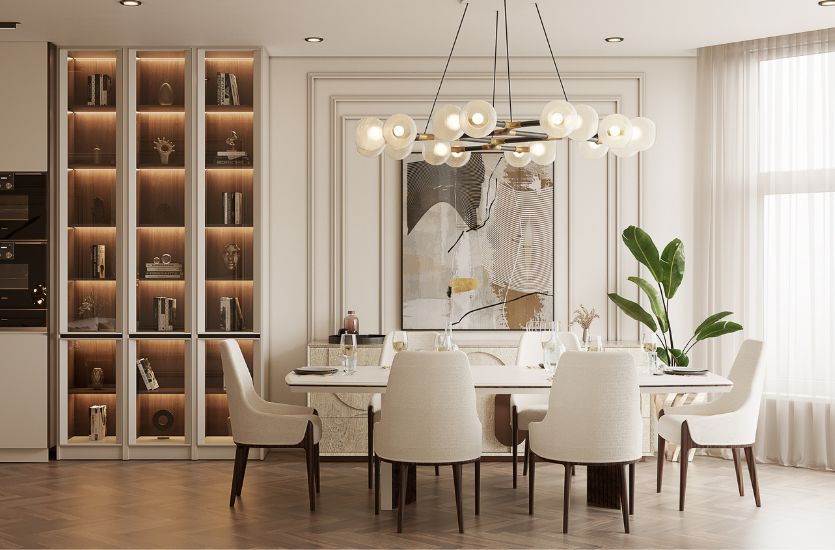 Luxurious dimensions: the luxury sizes of Dining rooms to allow for bigger and more pieces of furniture so that more people can be entertained and the room looks spacious and grand; usually in large villas, penthouses, duplex apartments.